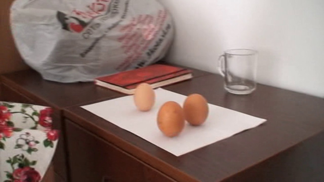 Оля на 1:57 минуте поставила яйцо на острый конец